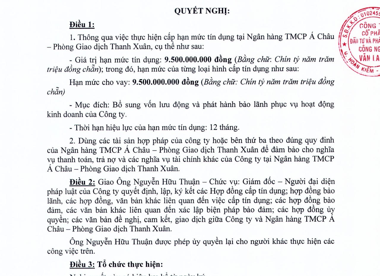 Mới đây, Công ty cổ phần Đầu tư và Phát triển Công nghệ Văn Lang (VLA: HNX) vừa thông qua nghị quyết vay 9,5 tỷ đồng tại Ngân hàng TMCP Á Châu.