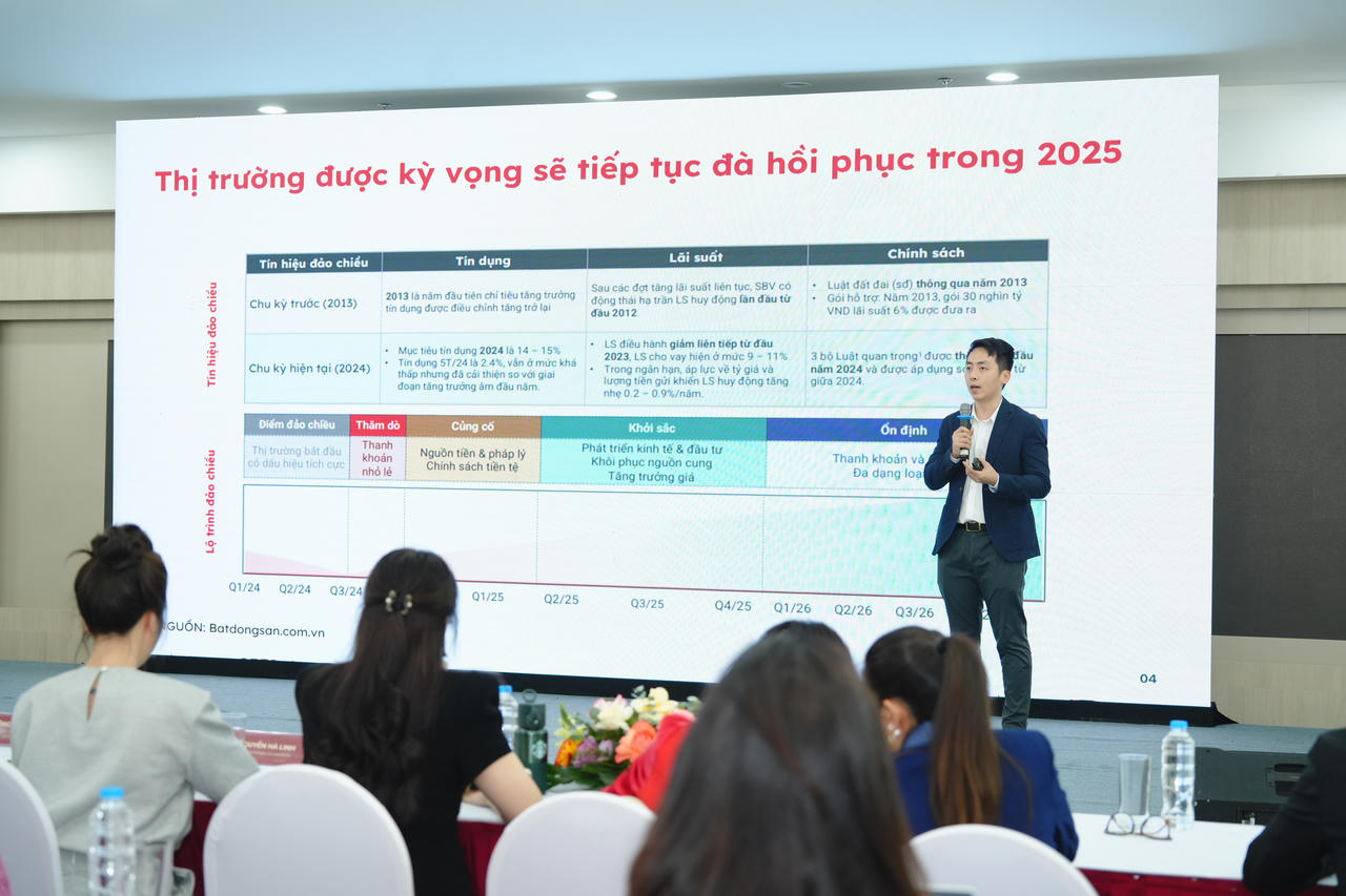 Ghi nhận trên trang Batdongsan.com.vn cho thấy, bất động sản (BĐS) đã đạt đỉnh vào năm 2021, có một cái đỉnh nữa vào 2022 trước khi sụt giảm rất là mạnh; vào 2023 thì đi ngang và 2024 có dấu hiệu hồi phục. Chiếu theo thực tế, đầu năm 2024 có đợt sốt chung cư rất là mạnh ở Hà Nội, và vào cuối năm có những tín hiệu tích cực hơn trong khu vực phía Nam cũng như ở các khu vực khác, như nhà ở thấp thấp tầng. Trong giai đoạn này thì mức giá rao bán liên tục tăng và không có dấu hiệu giảm mặc dù mức độ quan tâm có thể giảm, giá rất tốt.