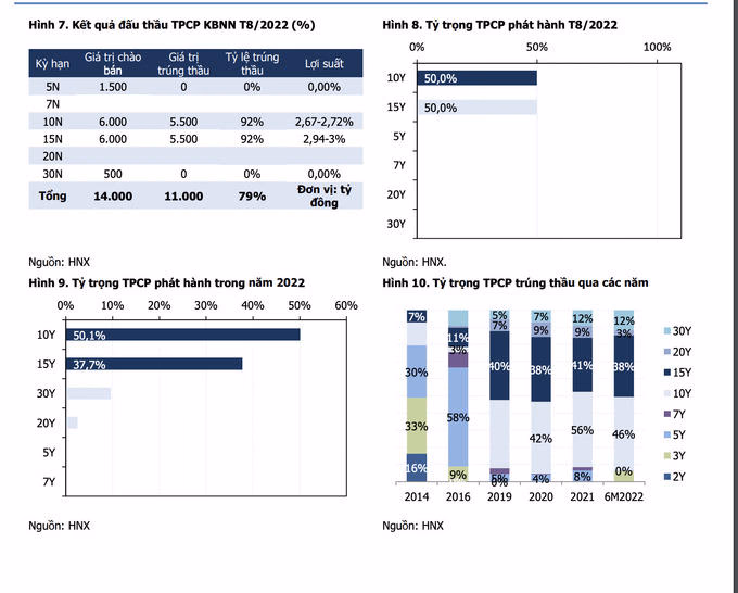 Trong số 14.000 tỷ đồng trái phiếu được chào bán, có 11.000 tỷ đồng được huy động, tỷ lệ 79%. Đến thời điểm hiện tại, KBNN mới phát hành được hơn 89 nghìn tỷ đồng TPCP, hiện chỉ đạt 22% kế hoạch năm 2022 là 400 nghìn tỷ đồng. Mức lợi suất trúng thầu của các trái phiếu tiếp tục tăng so với cuối tháng 7. Lợi suất kỳ hạn 10 năm và 15 năm lần lượt là 2,72%/năm và 3%/năm, tăng 14-17 điểm cơ bản so với cuối tháng 7/2022.