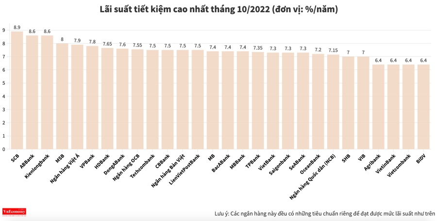 Điển hình là Ngân hàng TMCP Sài Gòn (SCB). Trước đó, SCB tăng lãi suất huy động các kỳ hạn khoảng 1%/năm từ ngày 8/10. Theo đó, mức cao nhất là 8,9%/năm dành cho kỳ hạn 24 tháng với chứng chỉ tiền gửi và cũng áp dụng mức lãi suất 8,9% cho tiền gửi kỳ hạn 36 tháng (trước đó là 7,55%/năm).