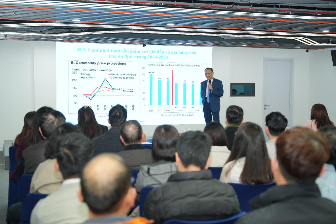 Tại buổi hội thảo, TS. Cấn Văn Lực dự báo tăng trưởng GDP năm 2025 sẽ đạt 8% cho kịch bản cơ sở (năm 2024 đạt 7,09%), cao hơn so với mức trung bình thế giới và khu vực nhờ các động lực chủ yếu đến từ bán lẻ hàng hóa và tiêu dùng hồi phục 9% - 10%, xuất khẩu tăng trưởng 8% - 10%, FDI thực hiện tăng mạnh 10% - 12%.