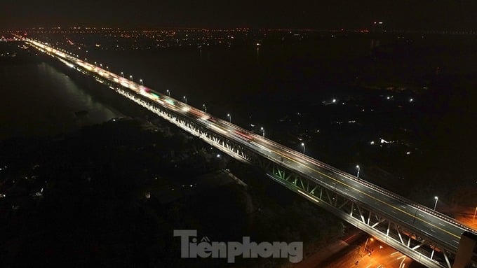Cầu Thăng Long về đêm lung linh ánh đèn.
