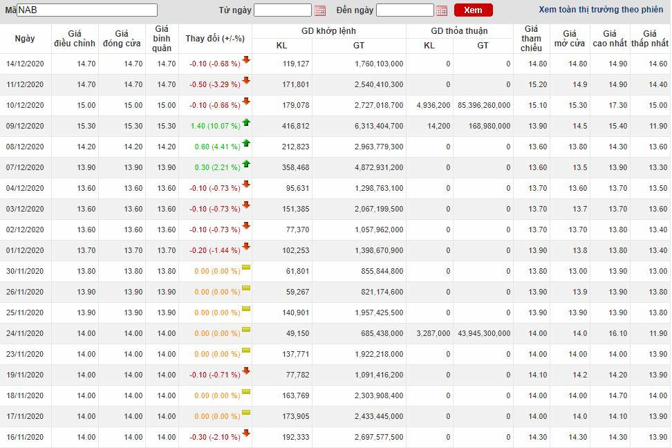 Kết thúc phiên giao dịch ngày 14/12, cổ phiếu NAB đã đánh mất 0.100 đồng (-0,68%) xuống giá 14.700 đồng/cp.