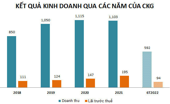 Theo thông tin từ CKG, tình hình thực hiện quý I/2022 doanh thu đạt 19%, lợi nhuận trước thuế đạt 20%. Ước lũy kế doanh thu và lãi trước thuế 6 tháng đầu năm 2022 của doanh nghiệp này đạt lần lượt 592 tỷ đồng và 94.3 tỷ đồng, tăng 54% và 58% so với kết quả cùng kỳ năm 2021.