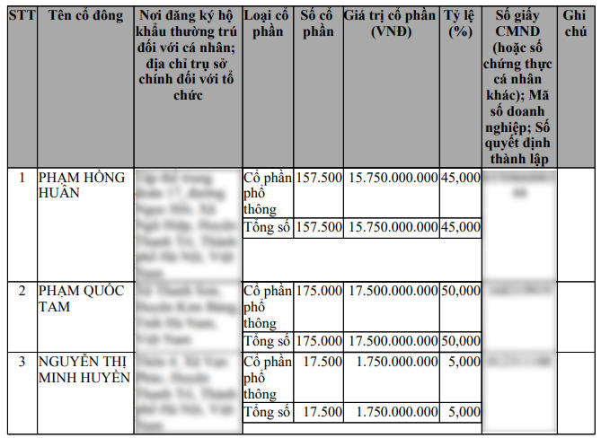 Cơ cấu cổ đông của Công ty TNHH Xây dựng 1-5 lúc này gồm: Phạm Quốc Tam góp 12 tỷ đồng, sở hữu 72,73% cổ phần; Phạm Thị Nguyệt góp 4 tỷ đồng, sở hữu 24,24% cổ phần; Phạm Xuân Hảo góp 500 triệu đồng, sở hữu 3,03% cổ phần còn lại.