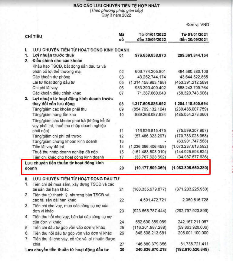 Qua đó, dòng tiền thuần âm 275 tỷ đồng, mặc dù dòng tiền đầu tư dương 341 tỷ đồng nhờ các khoản thu hồi cho vay, bán lại công cụ nợ và đầu tư góp vốn vào đơn vị khác.