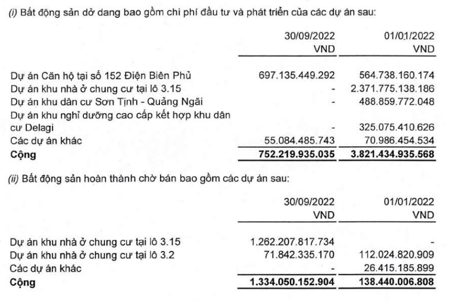Mặt khác, bất động sản hoàn thành chờ bán tăng từ 138 tỷ đồng lên 1.334 tỷ đồng, chủ yếu do ghi nhận mới 1.262 tỷ đồng từ dự án The River Thủ Thiêm. Bên cạnh đó, danh mục này cũng có 71,8 tỷ đồng từ dự án Khu nhà ở chung cư tại lô 3.2 (dự án D'Verano Thủ Thiêm), song đã giảm 36% so với đầu năm.