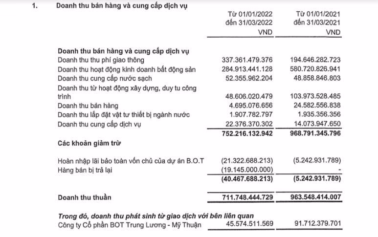 CII ghi nhận doanh thu thuần giảm 26% so với cùng kỳ 2021, chỉ thu về gần 712 tỷ đồng. Trong đó, doanh thu từ thu phí giao thông của CII trong quý 1/2022 đã phục hồi, tăng vọt 73%, đạt hơn 337 tỷ đồng. Trong khi đó mảng kinh doanh chính là bất động sản chỉ đem về 285 tỷ đồng, giảm 52% so với cùng kỳ. Ngoài ra, doanh thu từ hoạt động xây dựng, duy tu công trình cũng giảm 53%, chỉ còn hơn 48 tỷ đồng.