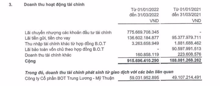 CII cho biết, doanh thu hoạt động tài chính của công ty trong quý đầu năm 2022 chủ yếu đến từ lãi chuyển nhượng các khoản đầu tư tài chính đạt 775,6 tỷ đồng (cùng kỳ năm 2021 không phải sinh khoản này); lãi tiền gửi, tiền cho vay đạt 136,6 tỷ đồng (tăng 43% so với cùng kỳ năm 2021).