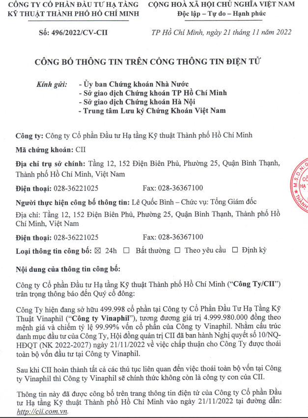 Hội đồng quản trị Công ty cổ phần Đầu tư Hạ tầng Kỹ thuật TP HCM (mã: CII) vừa thông qua kế hoạch thoái vốn tại Công ty cổ phần Đầu tư Hạ tầng Kỹ thuật Vinaphil nhằm cấu trúc danh mục đầu tư của công ty.