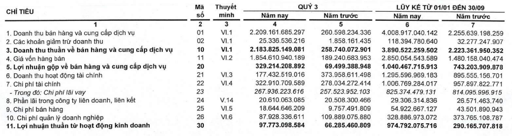 Lũy kế 9 tháng đầu năm, công ty đạt 3.891 tỷ đồng doanh thu thuần, lợi nhuận sau thuế 852 tỷ đồng, tăng lần lượt 75% và 577% so với cùng kỳ. Trong đó, lợi nhuận sau thuế của cổ đông công ty mẹ là 727 tỷ đồng, gấp 21,3 lần cùng kỳ năm ngoái.