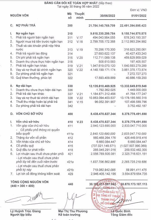 Về nguồn vốn, kết thúc quý II, tổng nợ phải trả của CII là 21,7 nghìn tỷ, giảm nhẹ so với hồi đầu năm. Trong đó, nợ ngắn hạn chiếm 9.600 tỷ, vay và nợ thuê tài chính ngắn hạn hơn 4.000 tỷ đồng. Nợ dài hạn, chiếm hơn 12 nghìn tỷ đồng, nợ vay và thuê tài chính dài hạn là hơn 10 nghìn tỷ đồng. Trong khi đó vốn chủ sở hữu của CII chỉ đạt hơn 8.000 tỷ đồng, chiếm tỷ lệ 27% so với tổng nguồn vốn, còn lại là nợ phải trả.