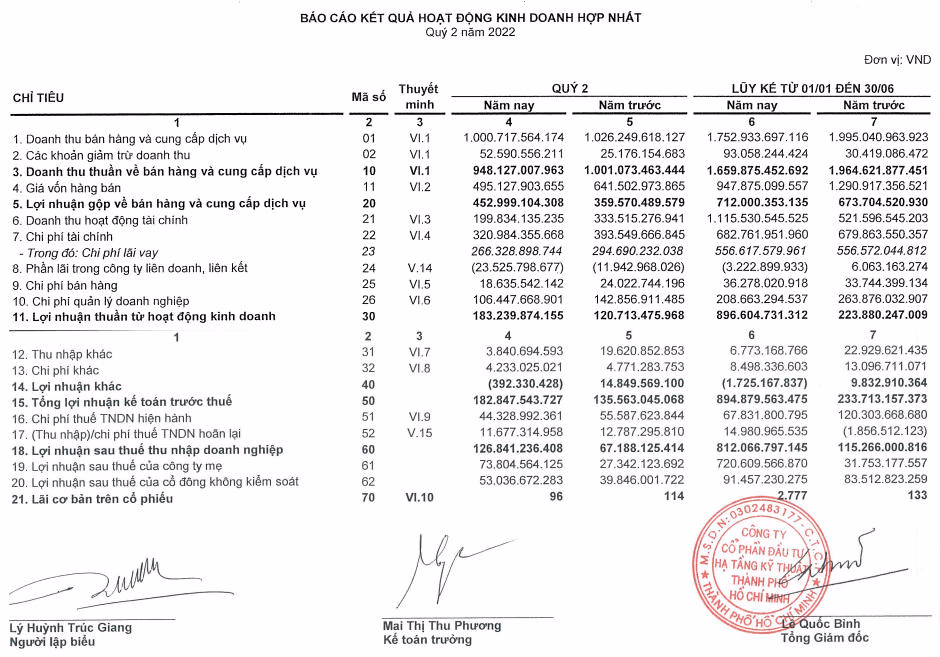 Theo báo cáo tài chính quý 2/2022 của CII, doanh thu bán hàng và cung cấp dịch vụ đạt hơn 1.000 tỷ đồng, giảm không đáng kể so với cùng kỳ; lợi nhuận sau thuế đạt hơn 126.8 tỷ đồng, tăng gần gấp đôi với cùng kỳ năm ngoái.