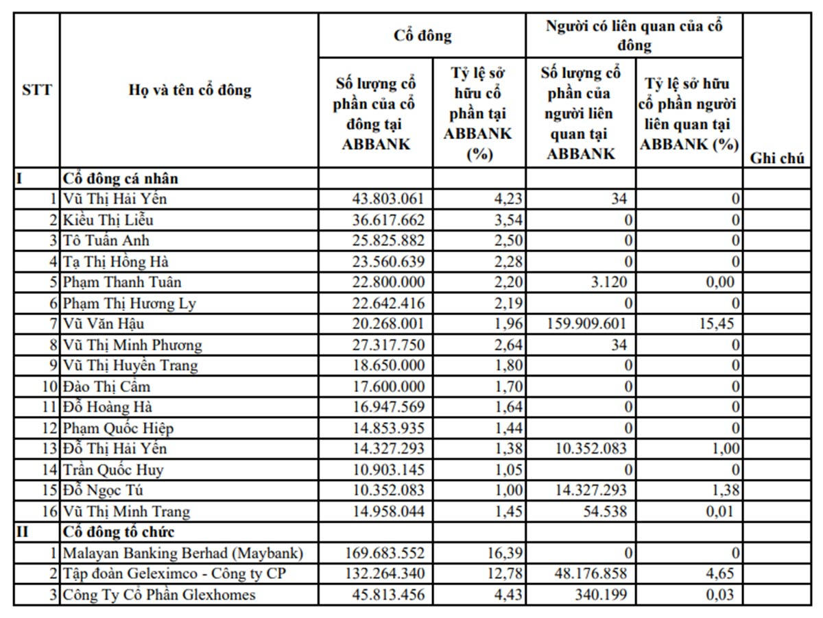 Theo danh sách này, tại thời điểm ngày 31/7/2024, ABBank có 19 cổ đông sở hữu từ 1% vốn điều lệ ngân hàng, gồm 16 cổ đông cá nhân và 3 cổ đông tổ chức. Các cổ đông này sở hữu hơn 689 triệu cổ phiếu ABB, tương đương 66,6% vốn điều lệ ngân hàng.