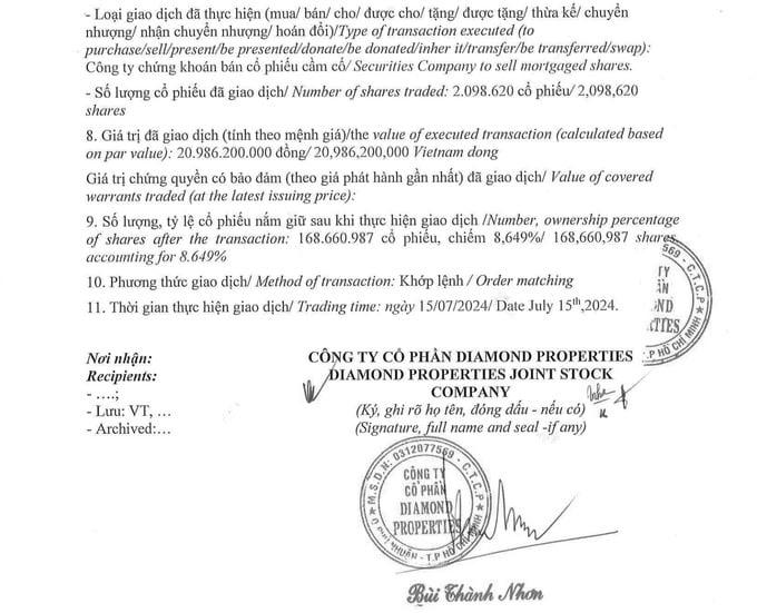 Công ty Cổ phần Diamond Properties thông báo đã bị công ty chứng khoán bán giải chấp gần 2,1 triệu cổ phiếu NVL của Công ty Cổ phầnTập đoàn Đầu tư Địa ốc No Va (gọi tắt là Novaland), qua đó giảm sở hữu xuống còn gần 169 triệu cổ phiếu tương ứng sở hữu 8,65% cổ phần.
