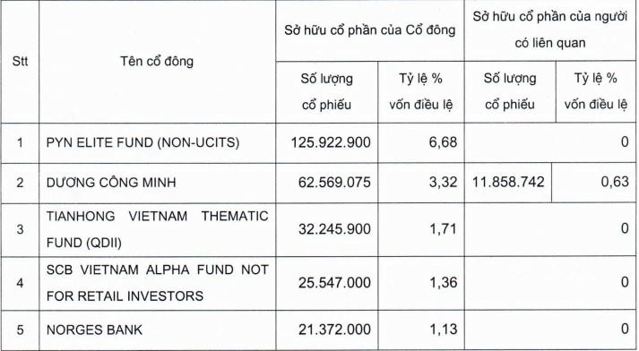 Trong khi đó, SCB Vietnam Alpha Fund Not For Retail Investors là một quỹ đầu tư đặc biệt của SCB Asset Management (SCBAM), công ty quản lý quỹ thuộc Siam Commercial Bank (SCB) ở Thái Lan. Còn lại, Norges Bank là ngân hàng trung ương của Na Uy và quản lý Quỹ Hưu trí Quốc gia Toàn cầu và dự trữ ngoại hối của ngân hàng này.