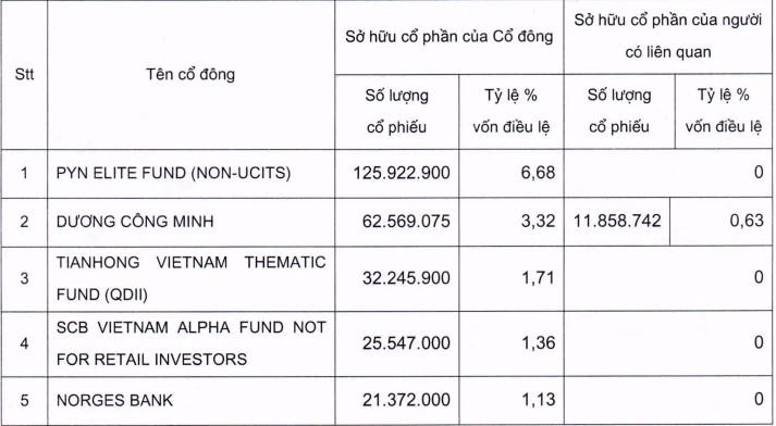 Theo đó, hiện có 5 cổ đông, trong đó có 4 cổ đông tổ chức và 1 cổ đông cá nhân, sở hữu từ 1% vốn điều lệ của Sacombank. Quỹ PYN Elite Fund là cổ đông nắm giữ hơn 125,9 triệu cổ phiếu, tương đương 6,68% vốn điều lệ của ngân hàng.