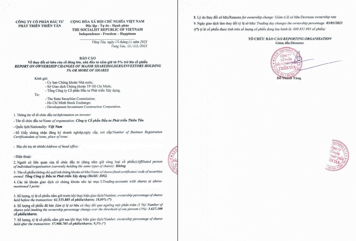 Trước đó, đầu năm 2023, Thiên Tân cũng đã bán ra 877.400 cổ phiếu DIG, giảm tỷ lệ sở hữu từ 11,07% xuống 10,92% vào ngày 11/01/2023.