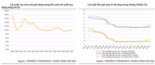 VNDirect cho rằng lãi suất huy động có thể tăng 30 - 50 điểm cơ bản trong nửa cuối năm nay. Ngoài ra, trong bối cảnh tín dụng hạn chế, lãi suất cho vay thế chấp của các ngân hàng tư nhân có thể tăng lên 10 - 10,5%/năm vào cuối năm nay nhưng vẫn thấp hơn so với mức 11 - 11,5%/năm trước đại dịch.