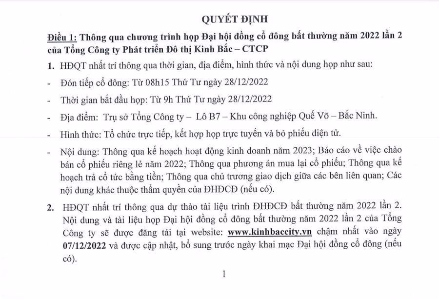 Hiện Kinh Bắc chưa công bố cụ thể các phương án và kế hoạch. Công ty cho biết sẽ đăng tải nội dung và tài liệu họp trên website chậm nhất vào ngày 7/12/2022 và được cập nhật, bổ sung trước ngày khai mạc Đại hội đồng cổ đông (nếu có).