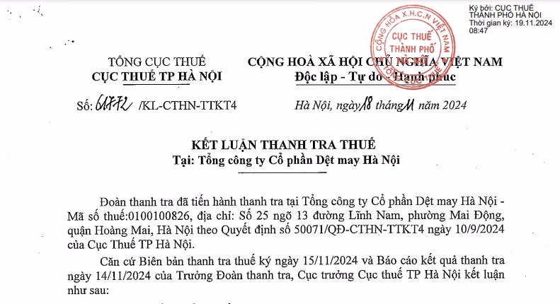 Cục Thuế TP. Hà Nội vừa ban hành kết luận thanh tra thuế tại Tổng công ty cổ phần Dệt may Hà Nội (Hanosimex), trong đó chỉ rõ những tồn tại về thuế tại doanh nghiệp này.