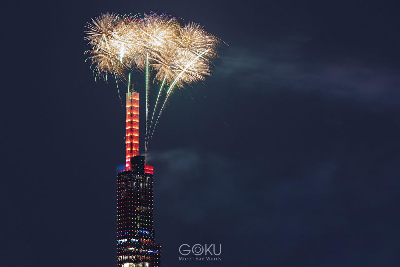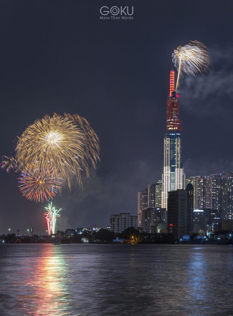 Bức ảnh bắt trọn khoảnh khắc pháo hoa tỏa sáng trên đỉnh toà tháp The Landmark 81 - tòa nhà cao nhất Việt Nam và nằm trong top những tòa nhà cao nhất thế giới, được xây dựng tại vị trí trung tâm của khu đô thị Vinhomes Central Park, quận Bình Thạnh, TP.HCM.