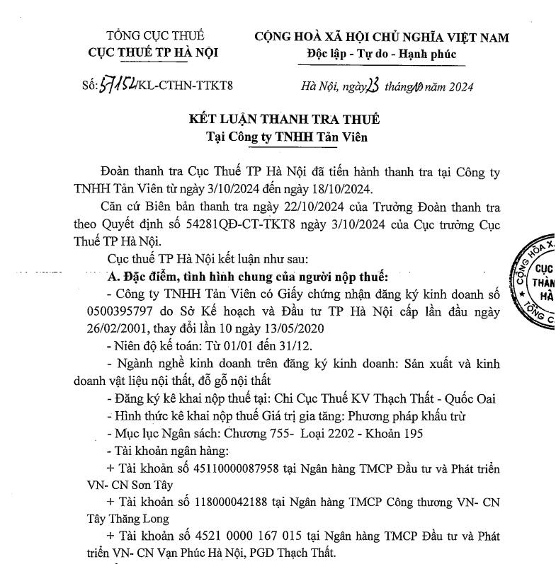 Cục Thuế TP. Hà Nội vừa ban hành kết luận thanh tra thuế tại Công ty TNHH Tản Viên, trong đó chỉ ra nhiều tồn tại trong hoạt động thuế của doanh nghiệp.