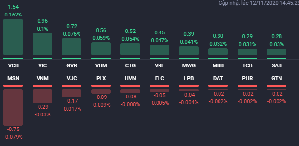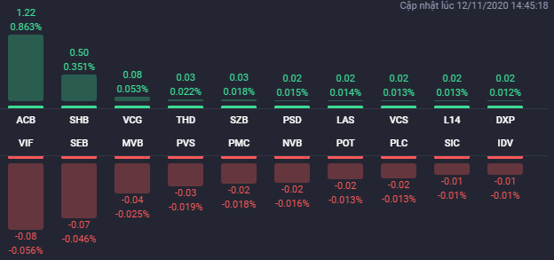 Phiên giao dịch ngày thứ Năm (12/11) diễn ra tích cực với việc cả 2 chỉ số chính VN-Index và HNX-Index đều có được mức tăng mạnh và đóng cửa ở mức cao nhất phiên. Hầu hết thời gian của phiên giao dịch, cả 2 chỉ số này đều biến động ở trên mốc tham chiếu.