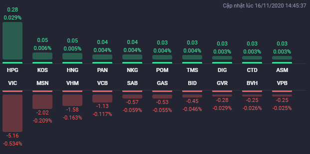 Trong đó, VIC giảm 5% xuống 102.000 đồng/cp, MSN giảm sát giá sàn xuống 83.900 đồng/cp, VHM giảm 2,2% xuống 76.600 đồng/cp, BVH giảm 2,2% xuống 54.000 đồng/cp, SAB giảm 1,7% xuống 181.800 đồng/cp.