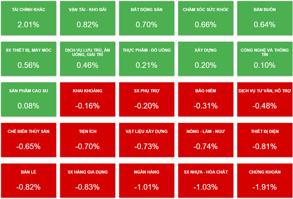 Trong khi đó, hàng loạt cổ phiếu thuộc nhóm ngân hàng hay chứng khoán đều biến động tiêu cực và khiến các chỉ số đi xuống. VCI giảm 2,5%, HCM giảm 2,4%, STB giảm 2,4%, SSI giảm 1,9%, VPB giảm 1,9%.