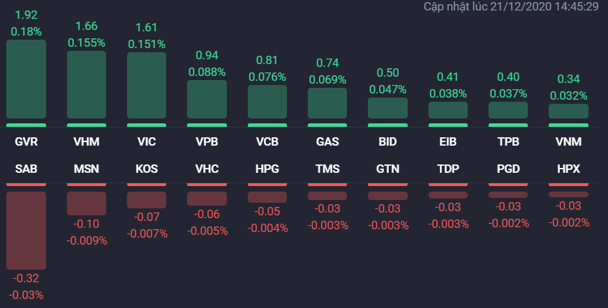Ở chiều ngược lại, các cổ phiếu lớn giảm giá có SAB, HSG, ACV, MSN hay HPG, nhưng mức giảm đều không quá lớn nên áp lực gây ra đến các chỉ số là khá yếu.