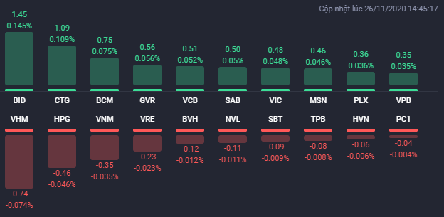 Tuy nhiên, sự phân hóa dần diễn ra rõ nét hơn và các chỉ số biến động giằng co quanh mốc 1.000 điểm. Tương tự như các phiên trước, biến động mạnh tiếp tục xảy ra vào cuối phiên khi lực cầu bất ngờ dâng cao và kéo hàng loạt cổ phiếu trụ cột tăng giá mạnh, 2 chỉ số chính vì vậy cũng kết thúc phiên trong sắc xanh.