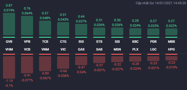 Bên cạnh đó, một số cổ phiếu vốn hóa lớn như VPB, GVR, TCB, MBB, VIB hay CTG… đều tăng giá mạnh và góp phần kéo VN-Index lên trên mốc tham chiếu vào cuối phiên. Chốt phiên, VPB tăng 3,1% lên 36.800 đồng/cp, GVR tăng 2,5% lên 32.650 đồng/cp, MBB tăng 1,5% lên 26.400 đồng/cp.