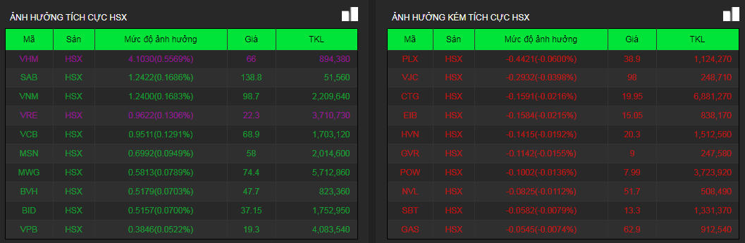 VHM tăng lên 66.000 đồng/cp và là mã có đóng góp lớn nhất cho VN-Index với 4,1 điểm, bỏ xa mã đứng sau là VNM với mức đóng góp chỉ là 1,1 điểm. VRE tăng lên 22.300 đồng/cp và có mức đóng góp gần 1 điểm cho VN-Index.