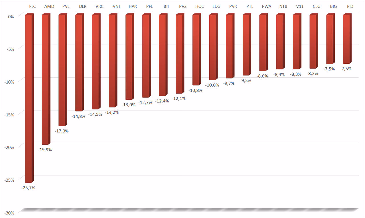 Bộ đôi cổ phiếu cùng “hệ sinh thái” là FLC của Tập đoàn FLC và AMD của CTCP Đầu tư và Khoáng sản FLC Stone giảm rất mạnh với lần lượt 25,7% và 19,9%. Ngày 29/3, Cơ quan cảnh sát điều tra Bộ Công an ra quyết định khởi tố vụ án, khởi tố bị can với ông Trịnh Văn Quyết - Chủ tịch HĐQT Tập đoàn FLC, để điều tra tội thao túng thị trường chứng khoán. Thông tin trên ngay lập tức khiến toàn bộ các cổ phiếu cùng “hệ sinh thái” FLC giảm sàn nhiều phiên với dư bán giá sàn hàng triệu đến chục triệu đơn vị.