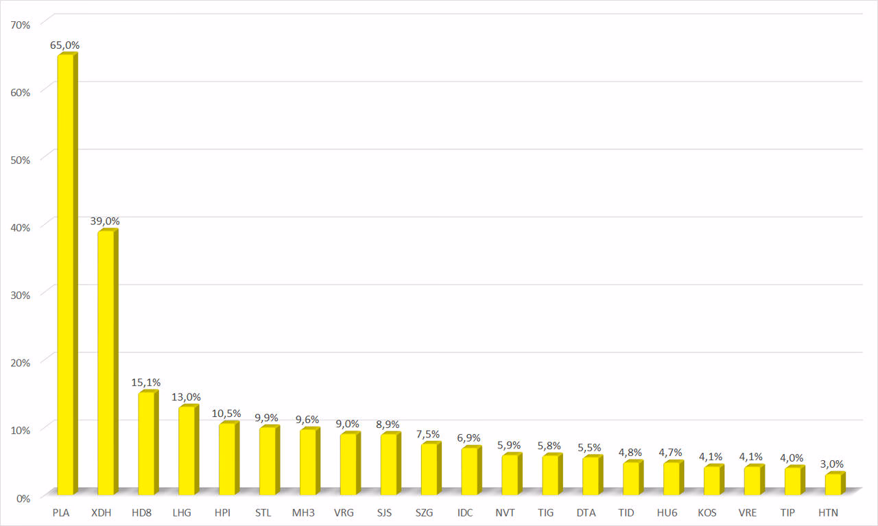 Ở chiều ngược lại, cổ phiếu PLA của CTCP Đầu tư Dịch vụ Hạ tầng Xăng Dầu tăng giá mạnh nhất trong nhóm bất động sản với 65%. Hiện giá cổ phiếu PLA đã leo lên mức cao nhất lịch sử 13.164 đồng/cp. Thanh khoản của cổ phiếu này tăng mạnh so với tuần trước đó nhưng vẫn duy trì ở mức thấp với khối lượng khớp lệnh bình quân chỉ ở mức 54.600 đơn vị/phiên.