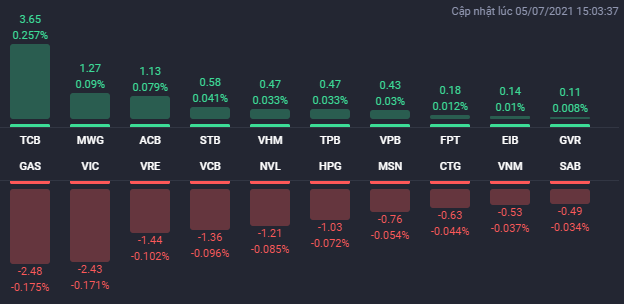 Thị trường chứng khoán phiên 5/7 biến động theo chiều hướng bất ngờ. Đây là phiên đầu tiên hệ thống giao dịch mới của HoSE do FPT cũng cấp đi vào hoạt động. Ngay từ đầu phiên giao dịch, áp lực bán mạnh đã xuất hiện và khiến hàng loạt cổ phiếu vốn hóa lớn giảm giá từ đó, các chỉ số cũng lùi xuống dưới mốc tham chiếu.