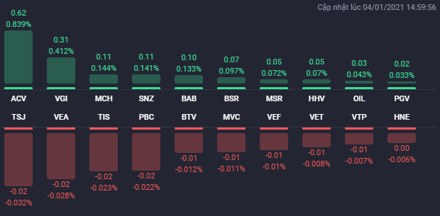 Kết thúc phiên giao dịch, VN-Index tăng 16,6 điểm (1,5%) lên 1.120,47 điểm. Toàn sàn có 380 mã tăng, 75 mã giảm và 44 mã đứng giá. HNX-Index tăng 3,16 điểm (1,56%) lên 206,28 điểm. Toàn sàn có 131 mã tăng, 61 mã giảm và 56 mã đứng giá. UPCoM-Index giảm 0,25 điểm (-0,34%) xuống 74,2 điểm.