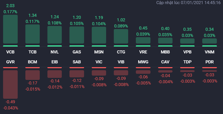 Bên cạnh đó, các cổ phiếu lớn khác như KDC, PVD, MSN, GAS... cũng tăng giá tốt và cùng với nhóm ngân hàng giúp củng cố vững đà tăng của các chỉ số.