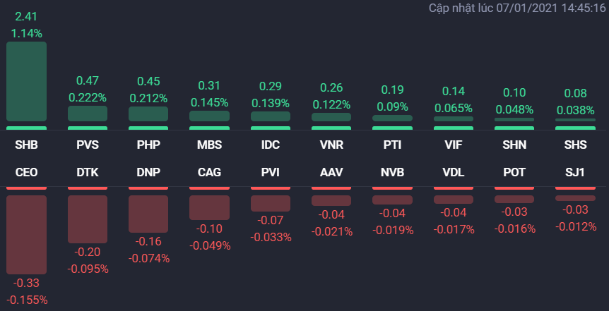 Kết thúc phiên giao dịch, VN-Index tăng 13,28 điểm (1,16%) lên 1.156,49 điểm. Toàn sàn có 302 mã tăng, 142 mã giảm và 53 mã đứng giá. HNX-Index tăng 4,55 điểm (2,15%) lên 216,23 điểm. Toàn sàn có 132 mã tăng, 70 mã giảm và 54 mã đứng giá. UPCoM-Index tăng 0,56 điểm (0,75%) lên 75,38 điểm.
