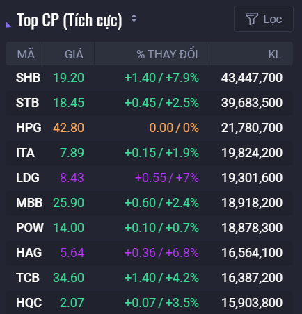Các mã như SHB, HDB, TCB, CTG, STB, MBB... đều đồng loạt tăng giá mạnh và là nhóm cổ phiếu có đóng góp quan trọng nhất trong việc giữ vững sắc xanh của các chỉ số. Trong đó, SHB tăng 7,9% lên 19.200 đồng/cp, HDB tăng 4,5% lên 26.800 đồng/cp, TCB tăng 4,2% lên 34.600 đồng/cp, CTG tăng 2,6% lên 38.850 đồng/cp.
