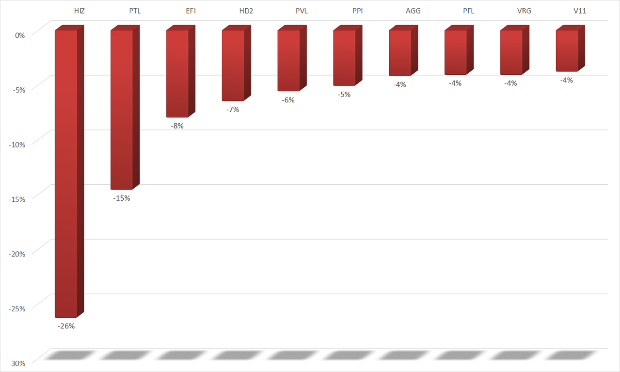 Ở hướng ngược lại, cổ phiếu giảm mạnh nhất nhóm bất động sản là HIZ của CTCP Khu công nghiệp Hố Nai với 26,3%. Tuy nhiên, thanh khoản của HIZ duy trì ở mức rất thấp, thậm chí, cổ phiếu này chỉ có giao dịch trong 2 phiên 11 và 12/8.