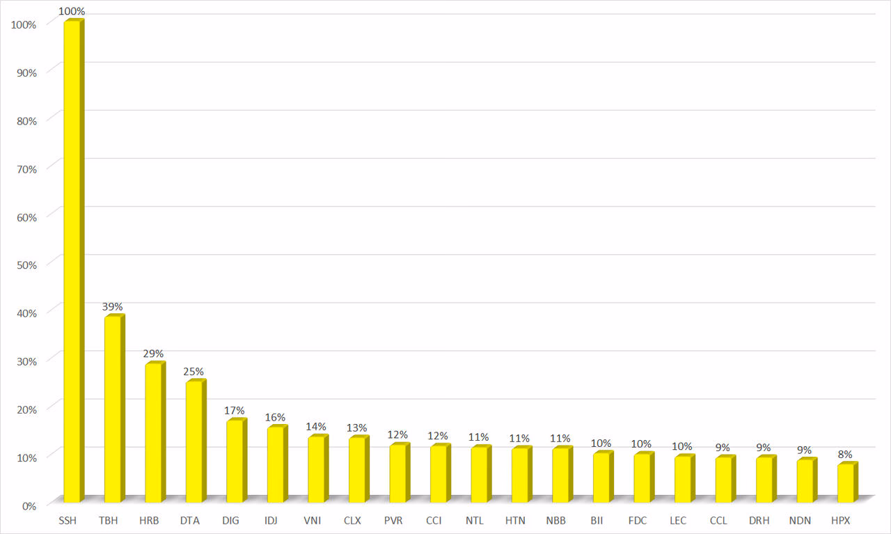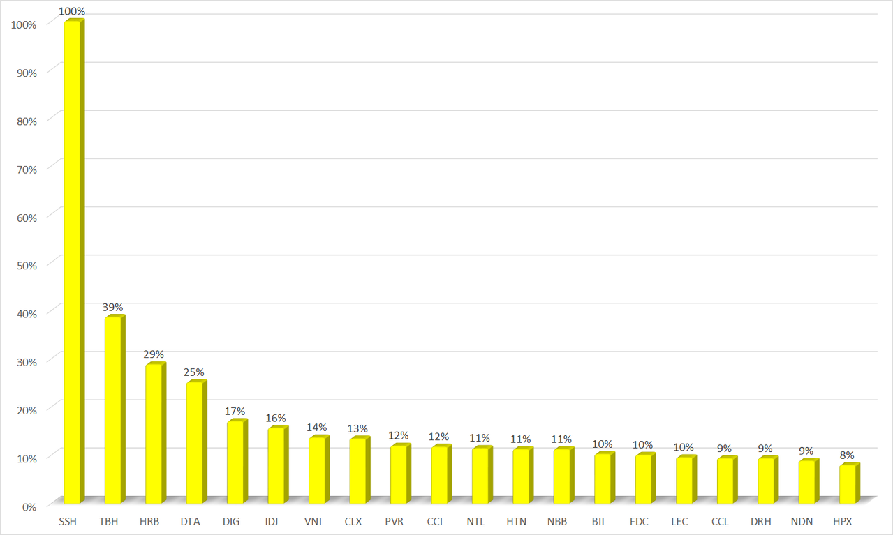 Đáng kể nhất là 2 tân binh của thị trường là SSH của CTCP Phát triển Sunshine Homes và TBH của CTCP Tổng Bách Hóa. Trong đó, SSH lên sàn UPCoM từ hôm 4/8 với giá tham chiếu 21.600 đồng/cp, sau đó, cổ phiếu này có 8 phiên tăng trần liên tiếp lên mức 79.800 đồng/cp, tương ứng gấp gần 3,7 lần. Chỉ tính riêng trong tuần qua, SSH tăng 100% từ 39.900 đồng/cp lên 79.800 đồng/cp.