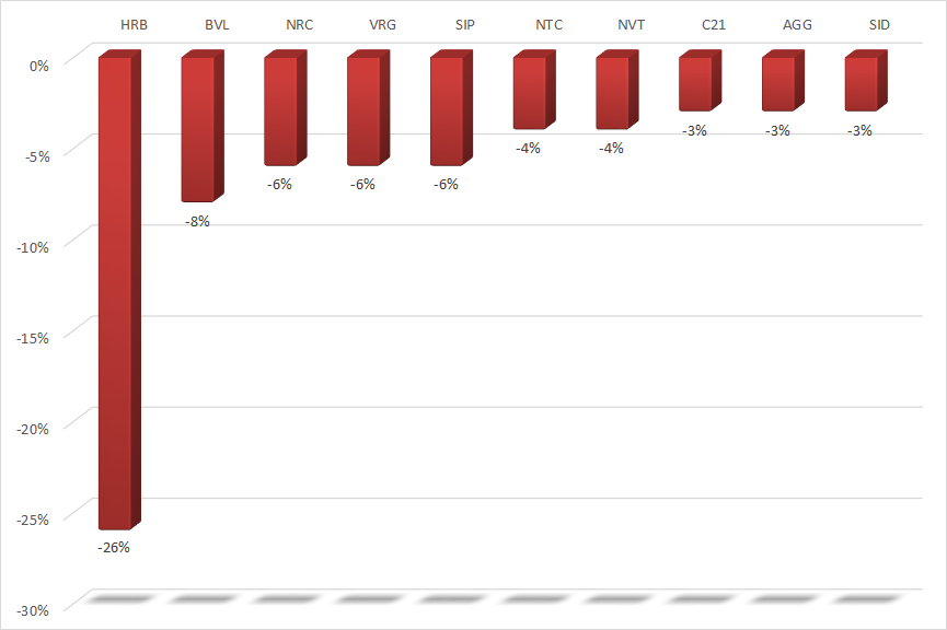 Ở chiều ngược lại, vẫn còn một số cổ phiếu bất động sản đi xuống trong tuần đầu tháng 8 bất chấp những biến động tích cực của nhóm ngành này. Tuy nhiên, đa số các mã giảm đều có thanh khoản thấp, dù vậy vẫn có những cái tên thanh khoản cao đáng chú ý như NRC của Tập đoàn Danh Khôi (giảm 6,4%), AGG của CTCP Đầu tư và Phát triển Bất động sản An Gia (giảm 2,6%)…
