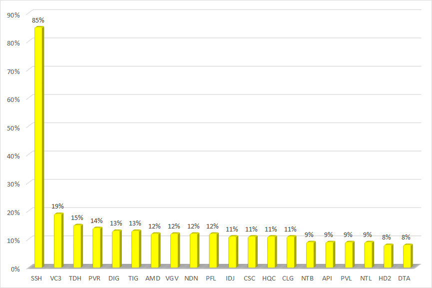 Trong khi đó, “tân binh” của thị trường chứng khoán là SSH của CTCP Phát triển Sunshine Homes tăng giá mạnh nhất nhóm bất động sản với 84,82% chỉ sau 3 phiên giao dịch. Phiên 4/8, 250 triệu cổ phiếu của SSH lên giao dịch trên UPCoM với giá tham chiếu 21.600 đồng/cp. Cổ phiếu này sau đó đã có 3 phiên tăng trần liên tiếp và leo lên mức 39.900 đồng/cp.