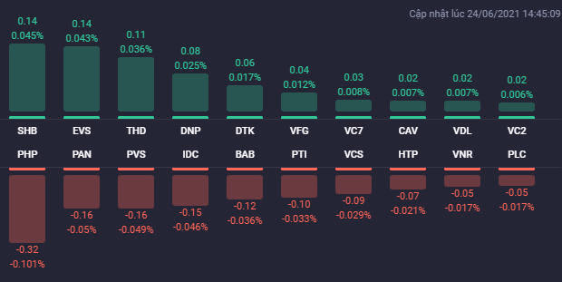 Kết thúc phiên giao dịch ngày 24/6, VN-Index tăng 2,85 điểm (0,21%) lên 1.379,72 điểm. Toàn sàn có 112 mã tăng, 274 mã giảm và 53 mã đứng giá. HNX-Index giảm 0,72 điểm (-0,23%) xuống 315,08 điểm. Toàn sàn có 65 mã tăng, 135 mã giảm và 69 mã đứng giá. UPCoM-Index giảm 0,36 điểm (-0,4%) xuống 9,68 điểm.