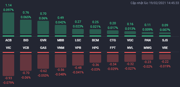 Thị trường chứng khoán phiên giao dịch ngày 19/2 không còn giữ được đà tích cực như 2 phiên trước. Ngay từ đầu phiên, áp lực bán đã dâng cao và đẩy hàng loạt cổ phiếu vốn hóa lớn lao dốc và điều này cũng khiến các chỉ số điều chỉnh. Tuy nhiên, nhờ lực đẩy của một vài mã trụ cột, nên có thời điểm, các chỉ số hồi phục tốt trở lại.