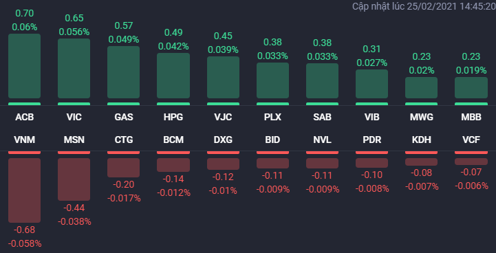 Thị trường chứng khoán phiên 25/2 vẫn đi theo chiều hướng giằng co tích lũy với những đợt tăng giảm đan xen của chỉ số chính VN-Index. Nhóm cổ phiếu lớn tiếp tục phân hóa mạnh và là nguyên nhân gây ra tình trạng trên của VN-Index.