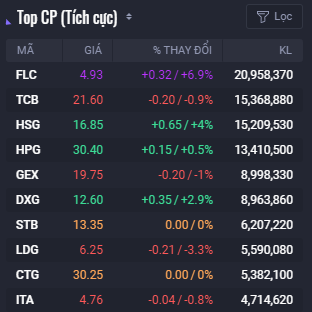 Tổng khối lượng giao dịch đạt 321 triệu cổ phiếu, tương ứng giá trị 6.000 tỷ đồng, trong đó, giao dịch thỏa thuận chiếm 951 tỷ đồng. Trong top 10 cổ phiếu khớp lệnh mạnh nhất thị trường có 4 mã bất động sản là FLC, DXG, LDG và ITA, trong đó, FLC khớp lệnh mạnh nhất thị trường với 21 triệu cổ phiếu.