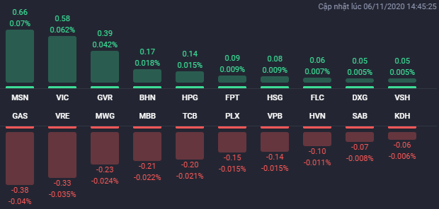 Thị trường chứng khoán phiên 6/11 có phiên tăng điểm nhẹ của các chỉ số với sự dẫn dắt của một số cổ phiếu trụ cột. VIC vẫn có đóng góp quan trọng trong việc giữ được sắc xanh của VN-Index.